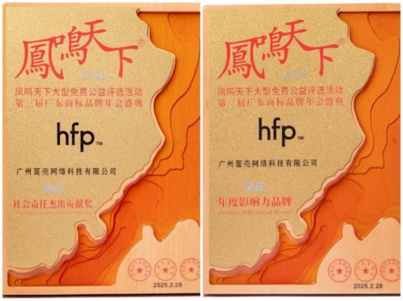 会议上,广州蛋壳网络科技有限公司(以下简称“蛋壳科技”)凭借其出色的品牌表现和市场影响力,成功获得2024年“TOP50我最喜爱的广东商标品牌”公益调查活动上榜品牌、“2025年凤鸣天下社会责任杰出贡献奖”、“2025年凤鸣天下年度影响力品牌奖”等三项殊荣。