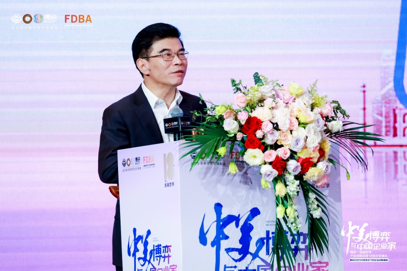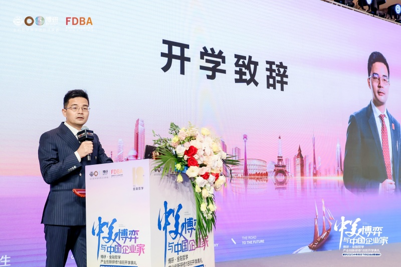博研哲学商学院欧阳清总裁致辞,介绍了本次论坛的历史、经济、政治和人文哲学四个维度,及未来博研哲学商学院的课程升级,融合东西方哲学与金融哲学,增设科学家时间,组织第二课堂与海外考察。最后引用朱熹语录启示学思并重,期待同学们用哲学点亮前行之路。