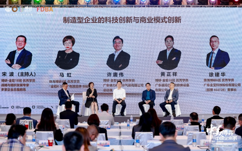 G2时代湾区产业领袖峰会,博研校友行业圆桌对话围绕《制造型企业的科技创新与商业模式创新》主题展开。在宋波博士的主持下,珠海金稻电器有限公司总经理马虹,广东德力梅塞尔气体有限公司总经理、金哲9班优秀校友代表许庸伟,广东德玛仕智能厨房设备有限公司董事长、金哲18班优秀校友代表黄正祥以及广东全宝科技股份有限公司董事长、珠海博研管理哲学6班优秀校友代表徐建华,他们结合企业实践经验,深入探讨在VUCA时代、经济逆全球化思潮背景下,中国制造型企业如何实现科技创新与商业模式创新,提升竞争力。
