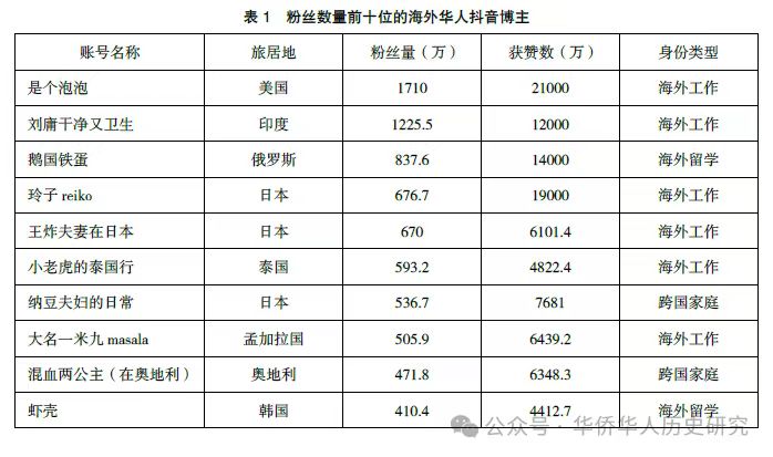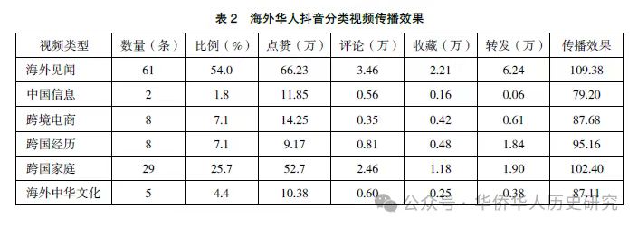 摘自:郑文标、王鹏璐:《抖音短视频平台海外华人博主跨国传播研究》,《华侨华人历史研究》2024年第1期。注释从略,如有需要请参见原文。