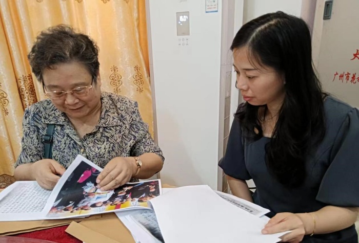 图为抗战老战士陈亮明巢湘玲伉俪女儿(左)向台山都斛镇干部详细讲述父辈当年营救文化名人的抗战往事