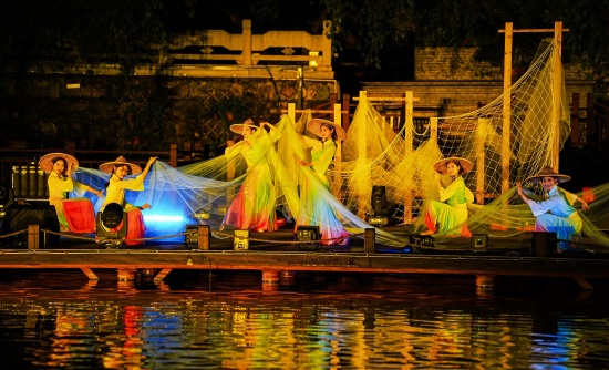 一是鹿颈疍家,金凤来仪。当晚19:00,《鹿颈疍家》情景舞剧在天后湖水上舞台首先亮相,该剧是以疍家人的日常生活为背景,展现他们独特的水上生活方式和深厚的海洋文化的情景剧表演。《鹿颈疍家》情景舞剧大幕将落时,一只在妈祖传说中象征着吉祥与瑞气的巨型“凤凰”悄然降临。它从高空俯冲而下,在湖面盘旋飞舞,绚烂的羽毛在夜色的映衬下熠熠生辉,正是《金凤来仪 福佑南沙》的特效表演,重现明朝时期鹿颈村民修建大角山天后庙时金凤来仪、福佑南沙的传说。