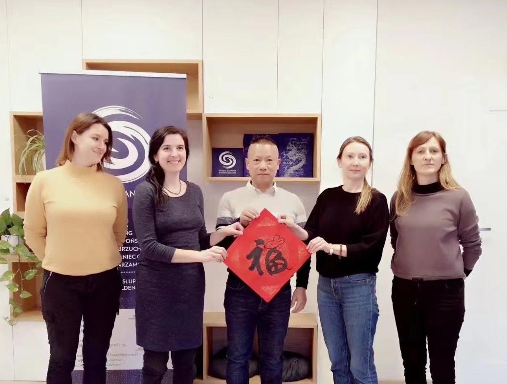 2020年春节期间,王千里在波兰丹田基金丹田培训机构交流并赠送中国“福”