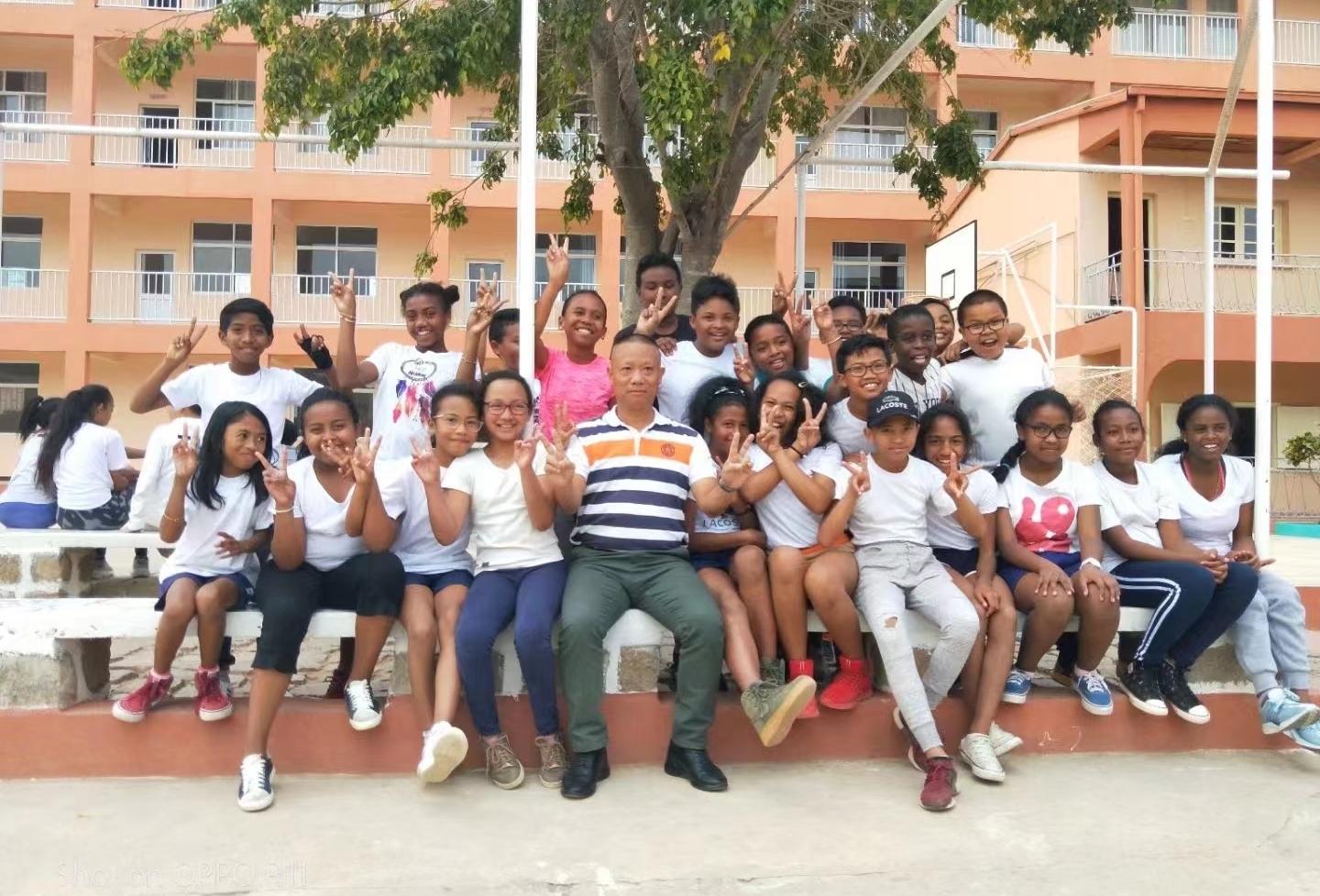 王千里在马达加斯加孔子学校教授中国武术并和孩子们留影