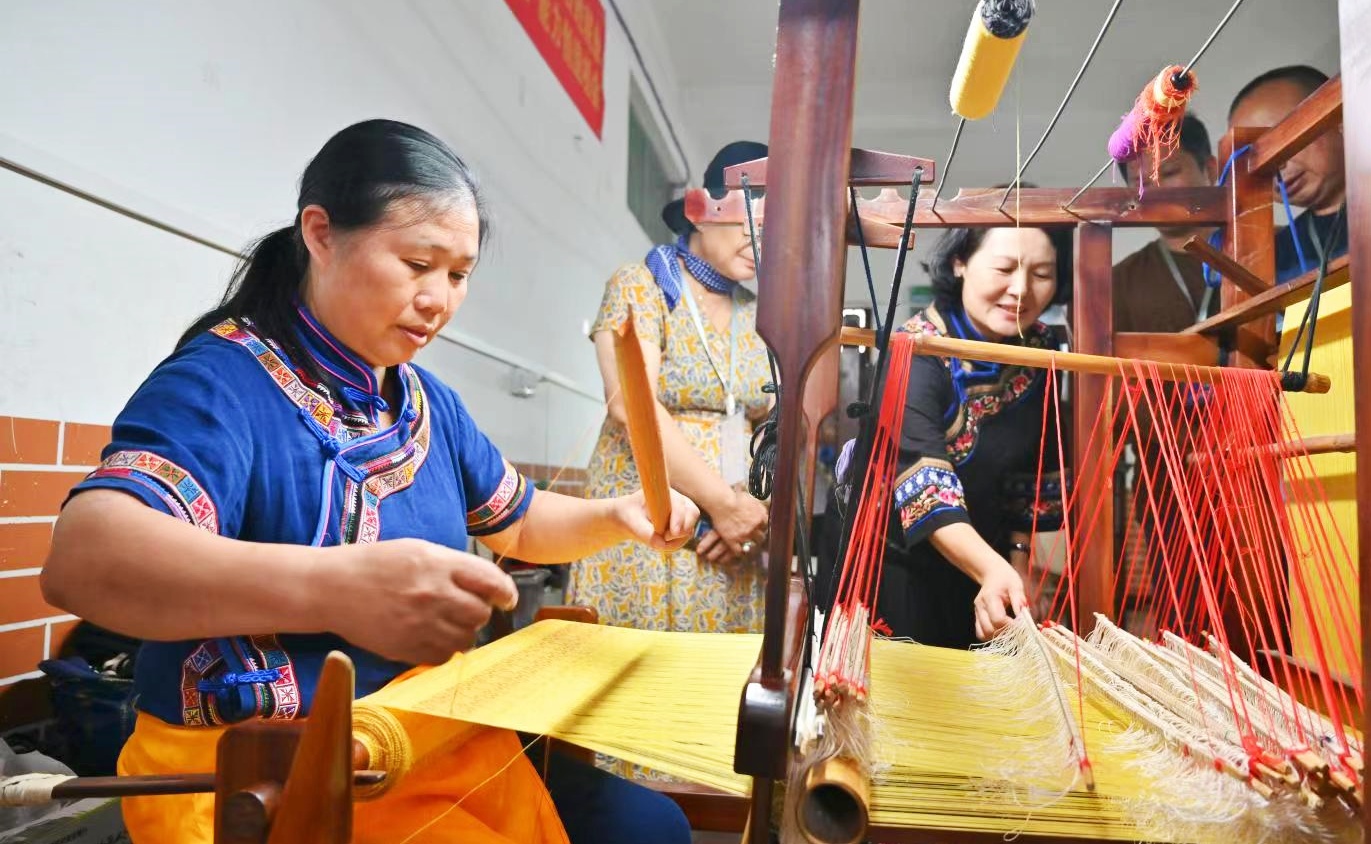 7月2日,广西百色靖西市壮锦厂织娘在织壮锦。 俞靖 摄
