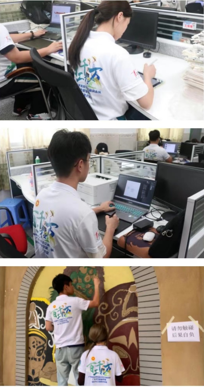 陆珊珊、谭激扬、罗睿老师指导的“绘彩揭西—墙绘设计双百突击队”在棉湖镇解放路、沿江路以及揭西县第二华侨中学等地展开工作,选取重点核心区域的墙面进行美化,将棉湖镇地域特色文化融入墙绘设计,展现传统文化与现代设计的碰撞,力求美化环境、展现文化、提升镇容、助力文旅发展。