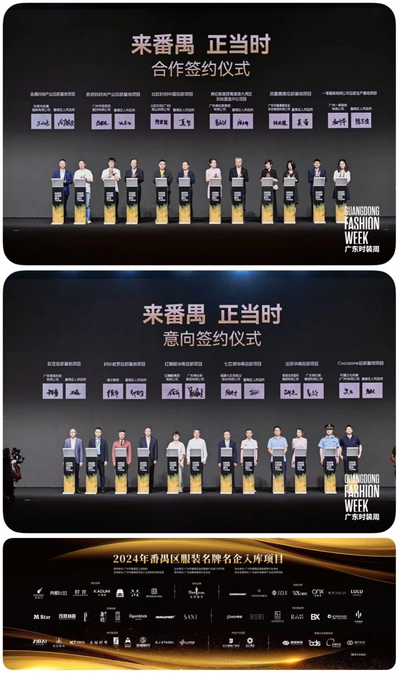 开幕式上,包括番禺区人民政府在内,佛伦斯集团、北欧时刻、凤凰惠康、辰辰妈、一享服装、金通服装、七匹狼、红蜻蜓、法派、衬衫老罗、Cocozone和欧定等共同参与签署了“来番禺 正当时”项目投资合作协议,各方将在多个领域展开深度合作,旨在推动番禺区的经济发展和社会进步。同时为助力打造第二个千亿级产业集群,广州市番禺区纺织服装产业链工作专班组织开展2024 年番禺区服装名牌名企评价发布推广活动,最终有45家企业入库2024 年番禺区名牌名企项目。