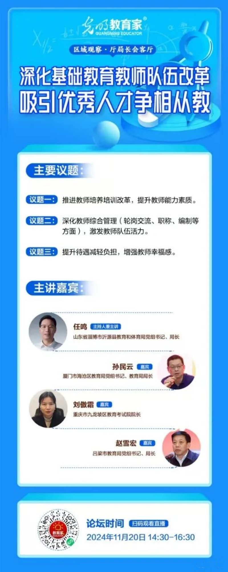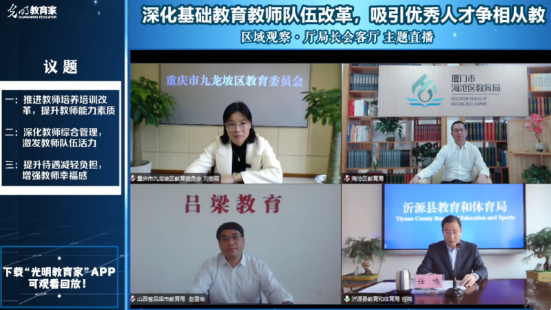 本期论坛以“深化基础教育教师队伍改革,吸引优秀人才争相从教”为议题,特别邀请了沂源县教育和体育局党组书记、局长任鸣,厦门市海沧区区委教育工委书记、区教育局党组书记、局长孙民云,吕梁市教育局党组书记、局长赵雪宏,重庆市九龙坡区教育考试院院长刘傲霜共同探讨。
