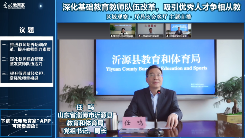 全球自由贸易网山东淄博讯(通讯员 宋尚建 王成明)11月20日,山东沂源县教育和体育局受邀参加《教育家》杂志【区域观察·厅局长会客厅】线上学术论坛直播,分享了我县在打造强师队伍,提升教师幸福感方面取得的显著成就和宝贵经验。