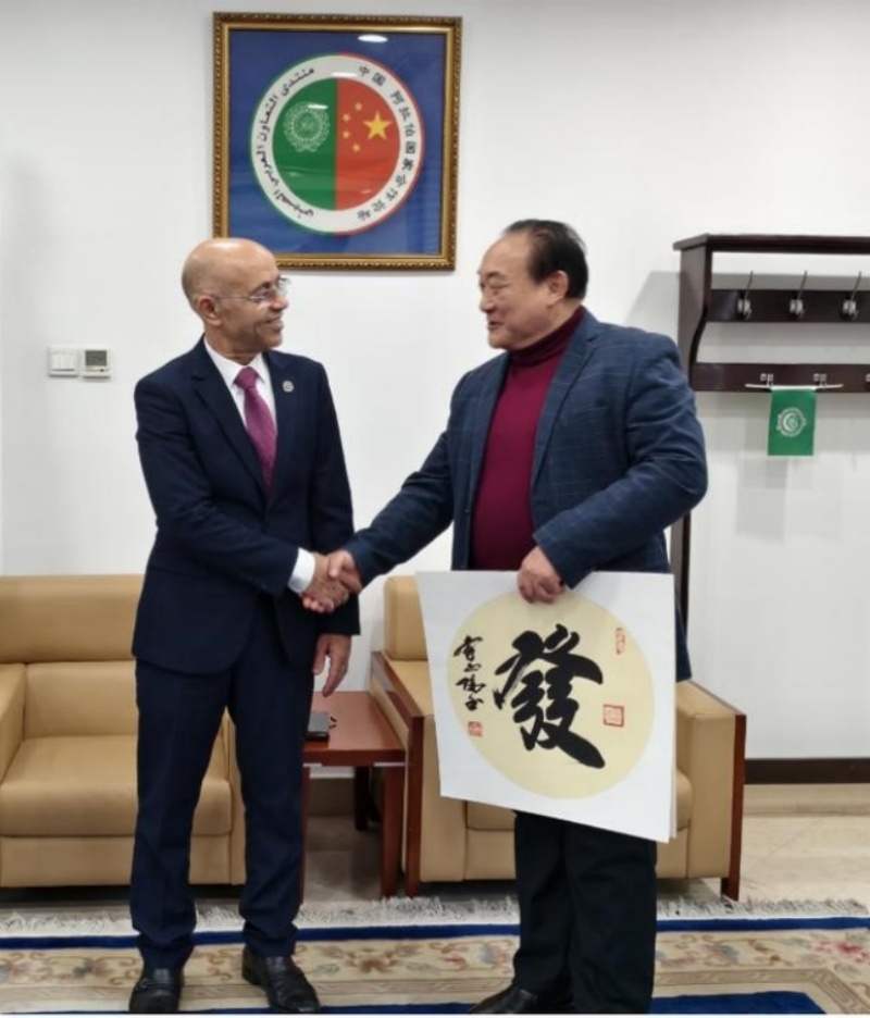驻华阿拉伯22国联盟主席艾哈迈德 . 穆斯塔法 . 法赫米大使(左)与中国书法家李正阳(右)亲切握手