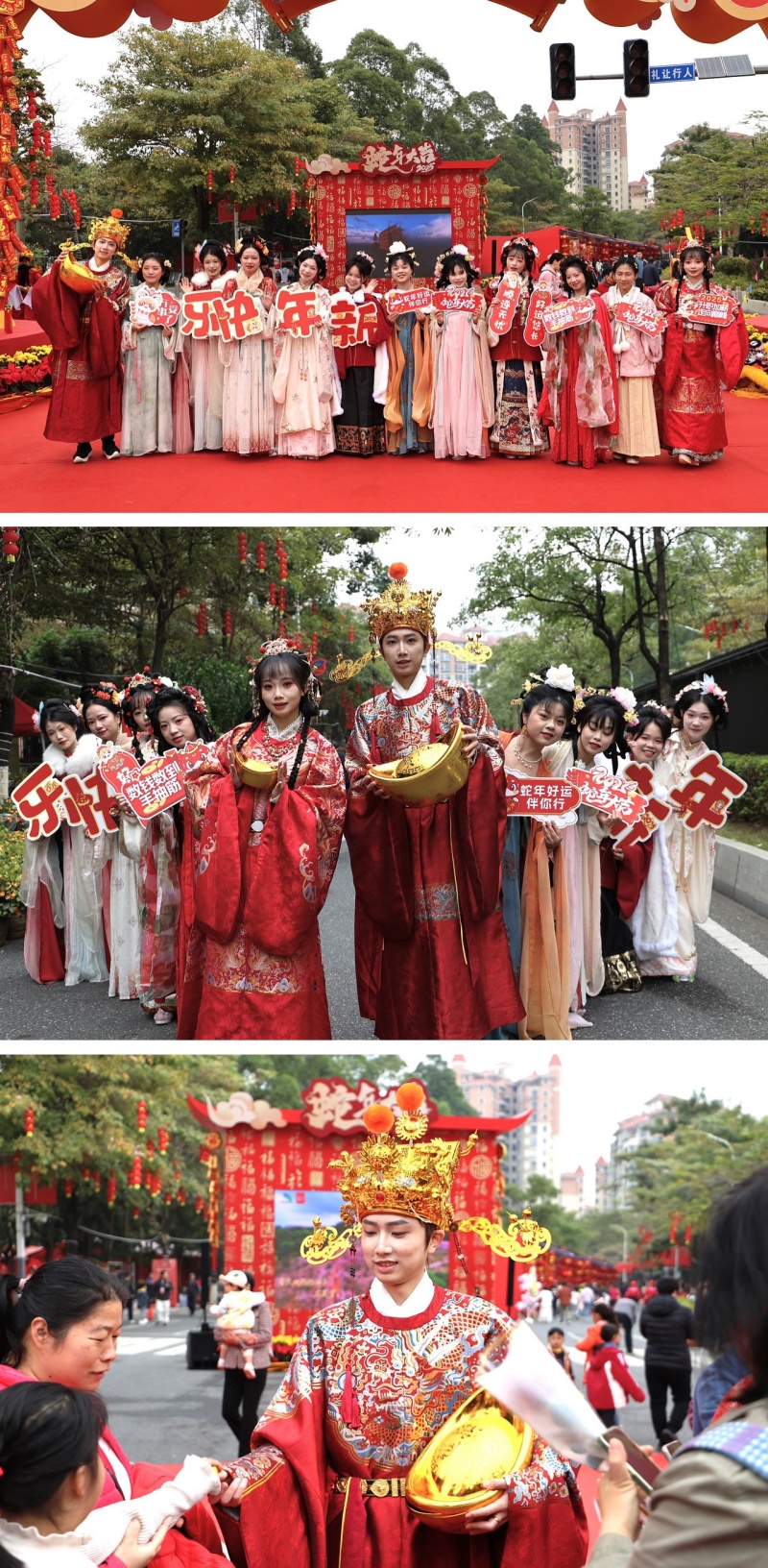早到的市民游客还有惊喜福利,“靓仔”财神爷现场派发糖果、巧克力,还有多位古风“靓女”巡游花街派发玫瑰花,寓意着“逛花街、有钱花”。“财神”扮演者三东曾多次扮演财神,今年是他第一次来到南沙,“南沙花市的活动很隆重,现场的街坊都很热情追捧财神,感觉到大家对发财是非常地憧憬和向往,我也希望能将祝福传递给大家。”三东分享说,他和同伴今晚还将现身蕉河迎春花灯游,想要和“财神”见面接福气的市民游客千万不要错过。