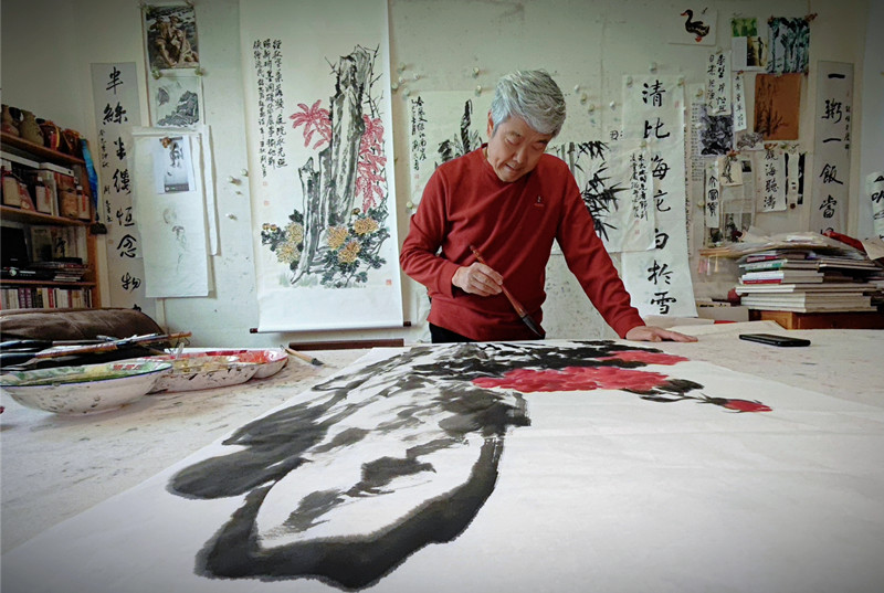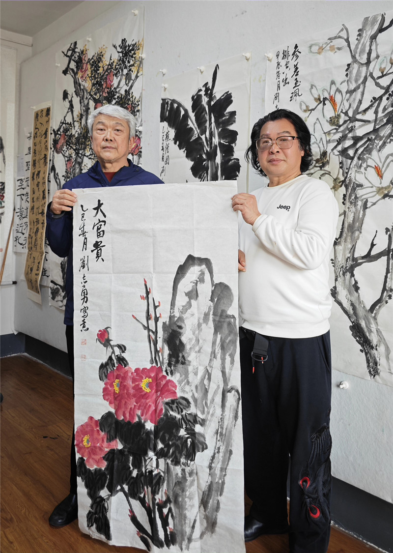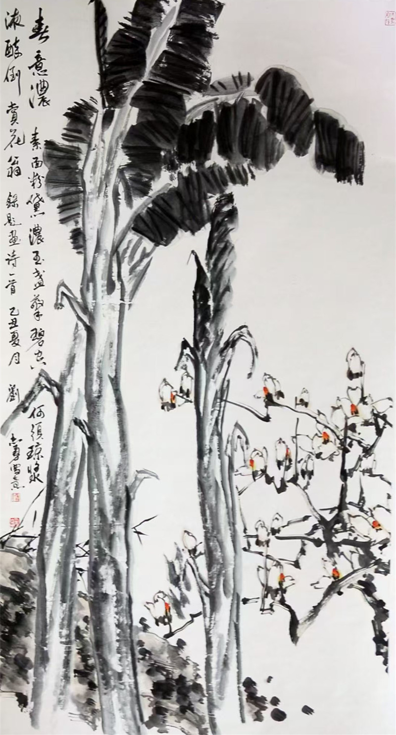 2021年,刘志勇光荣退休后,他深研古法而不拘成规,笔墨愈发苍劲雄健。画室中的残荷带着三十八载风霜雪雨的筋骨,墨竹蕴藏着不畏艰难的韧劲。那些被海内外珍藏的《墨池蕉影》,既是艺术臻品,更是岁月拓片,焦墨皴擦间依稀可辨守护平安的足迹,淡彩渲染中始终跃动着赤子初心。