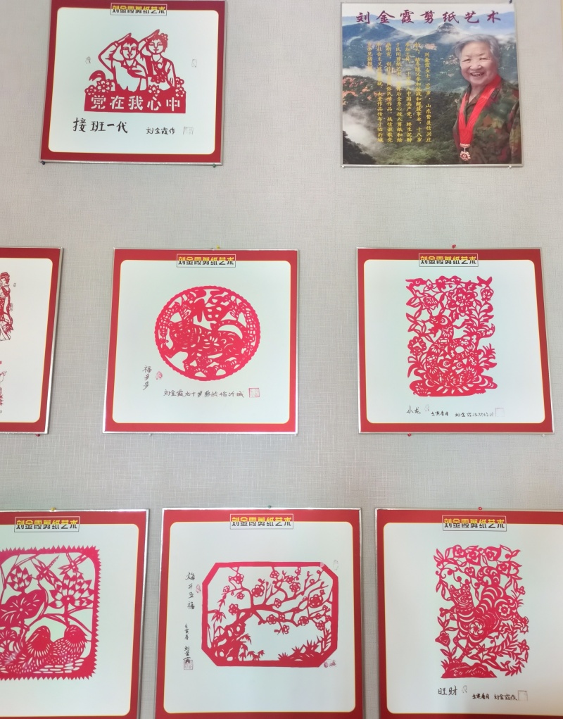 沂蒙地区民俗文化传承人、沂蒙红嫂式传奇人物94岁老革命刘金霞剪纸《多福娃》、《富贵吉祥》等珍品一宗。