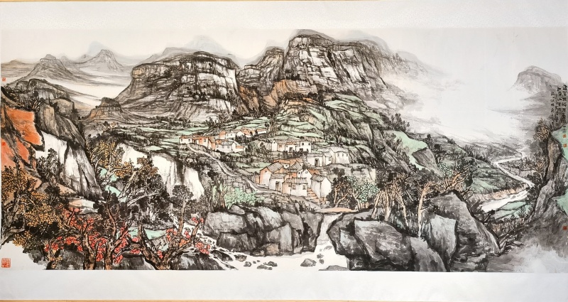 中国美术家协会会员、枣庄市美术家协会原副主席、枣庄春和艺术馆馆长鉴长春捐赠的山水画《鲁南揽胜》大作。