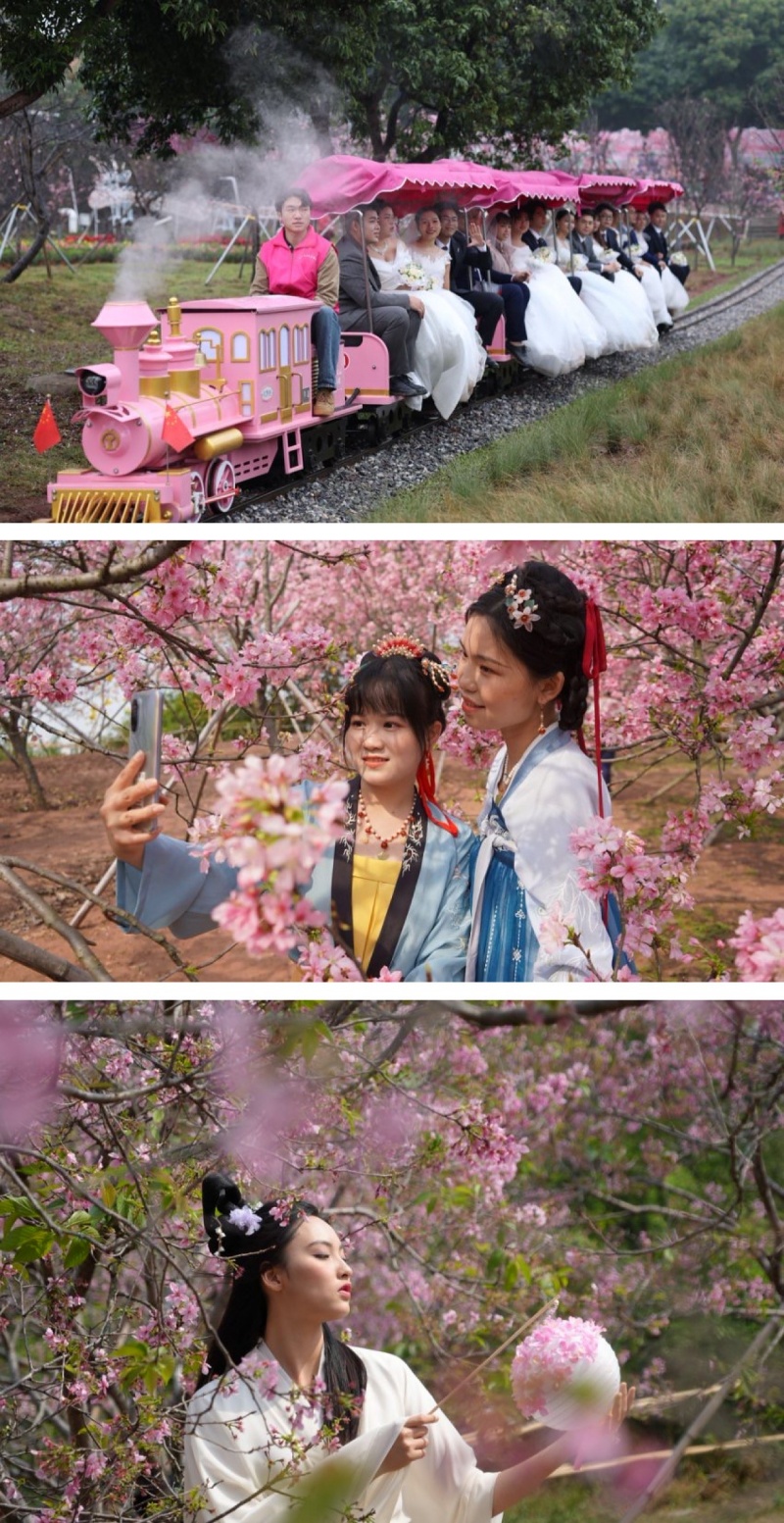 “多元化”丰富文体项目,打造全民节日。综合考虑不同游客需求,今年的樱花节期间也将加大文体活动的占比,精心策划丰富多样的文体活动,吸引各地游客,打造面向湾区、面向全国、面向世界游客的樱花节。一是启动“村晚”系列活动。在樱花节开幕式当晚精彩开启大岗“村晚”,晚会节目均由本地村民自编自演,各村将借此舞台展示“百千万工程”赋能乡村振兴崭新风貌。此外,“幸福里”党群服务集市也将在“村晚”现场设摊,党建引领志愿服务新风尚,为群众提供心理辅导、健康咨询等贴心志愿服务。二是邀请各界达人参与体验。邀请广东省青年美术家协会书画家现场采风,以笔墨丹青绘就烂漫樱花,留下传世佳作;邀请知名美食博主,穿梭在大岗的大街小巷,带着镜头探寻岗城味道,通过自媒体向万千网友展示大岗独特的饮食文化,吸引更多游客前来旅游;邀请音乐达人在樱花树下演奏,用悠扬的旋律与烂漫樱花相互交织,打造一场视听盛宴。三是引入多样化游乐设施。充分考虑不同年龄段孩子的需求,增设旋转木马、海盗船、旋转飞椅、充气城堡、自控飞机等,提升景区对家庭游客的吸引力。四是打造恐龙谷沉浸式体验区。在丛林中实景布设恐龙模型,依据恐龙种类与生活习性科学布局,营造逼真的恐龙生活场景,并定期开展研学课程,科普恐龙、地质等知识,打造趣味欢乐王国。