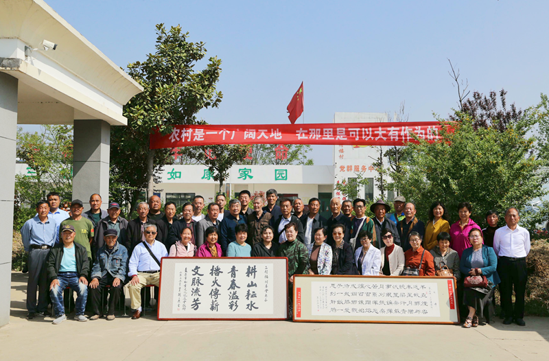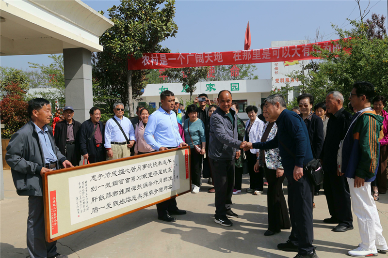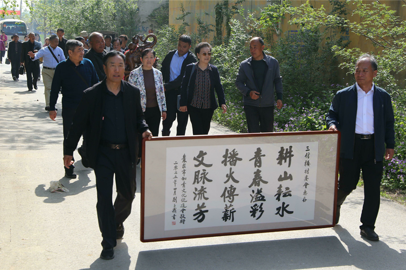 村委会大门前,在一阵鞭炮声中,山东省枣庄市知青文化促进会向三付楼村委会赠送了由枣庄市著名书法家刘玉鼎题字的牌匾:“耕山耘水青春溢彩,播火传薪文脉流芳”。三付楼村委也向知青回赠了纪念牌匾和礼品。互赠仪式热烈而又欢快,大家高兴地一起合影留念。