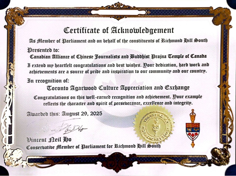 – 安大略省省议员白必勤(Aris Babikian, MPP)致贺,称沉香为“跨越信仰的文化瑰宝”,祝愿活动“促进深度交流与持久和谐”。