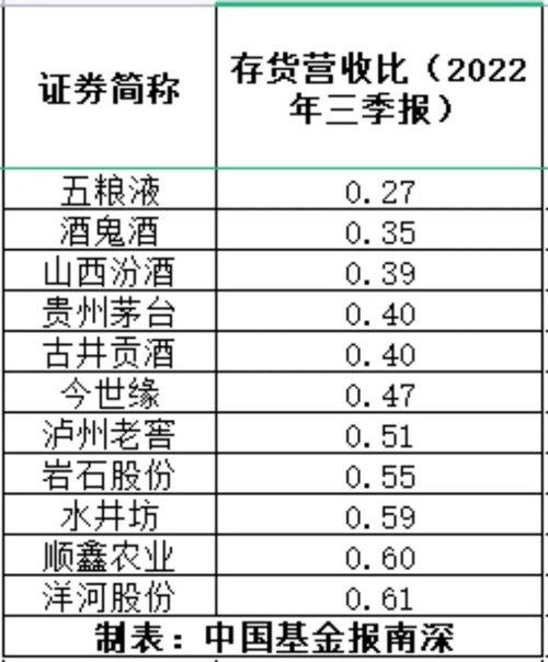 中国基金报记者根据东财chioce数据统计,目前已经上市的20家A股白酒公司,2022年前三季平均存货营收比在0.46,其中近一半在0.6以下,包括贵州茅台、五粮液等一线品牌,及今世缘、酒鬼酒等地方白酒品牌。