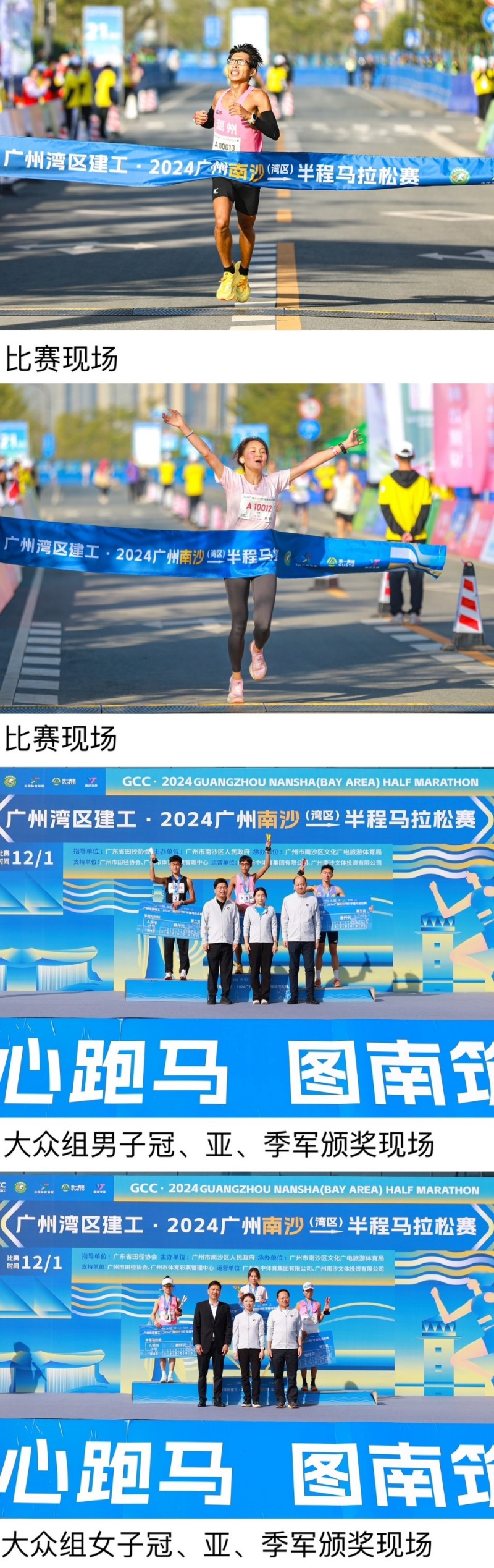 在半程马拉松终点,半马男子组、女子组排名靠前的选手成绩公布,情侣组、大学生组的排名将通过线上渠道公布,南沙区委副书记、区长吴扬,奥运跳水冠军郭晶晶,广州湾区建工有限公司书记、总经理周陈伟等担任颁奖嘉宾。