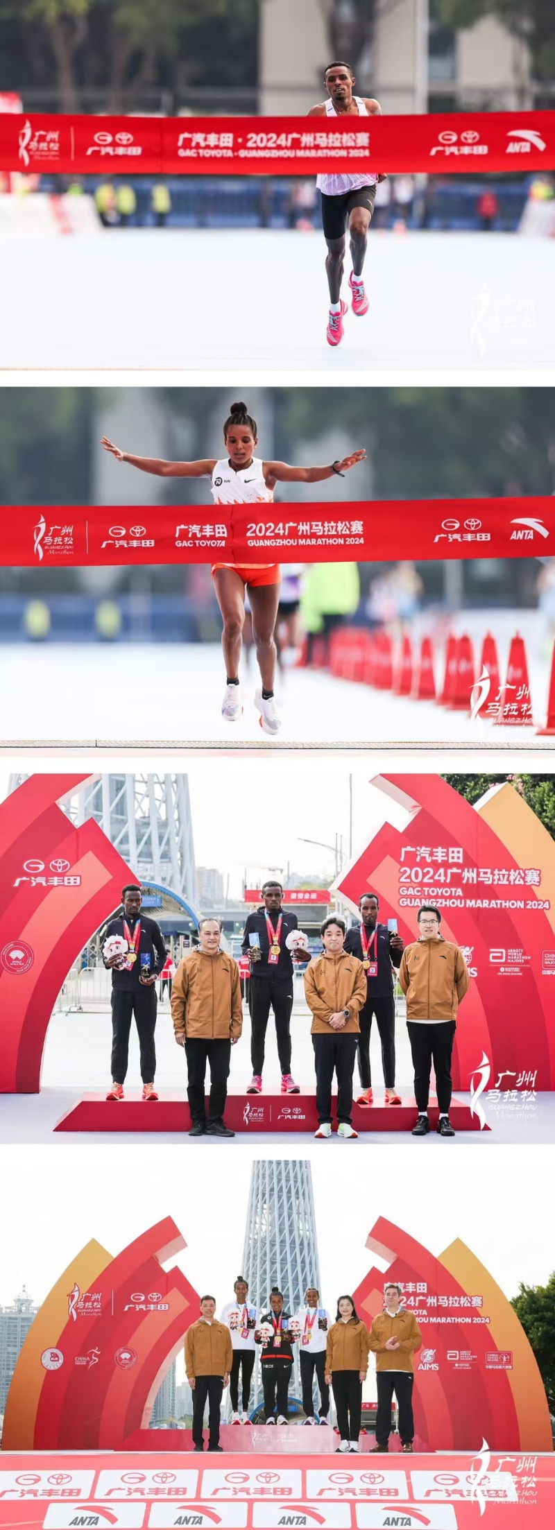 今年广州马拉松赛男子组比赛竞争异常激烈,运动员们也展现出极高的竞技水平,前五名选手均打破赛会纪录,彰显了选手的非凡实力。来自埃塞俄比亚的格比塞•莱莉莎•德贝莱GEBISE LELISA DEBELE以2小时06分28秒的成绩刷新赛会纪录获得冠军,并将其个人最好成绩提高了将近2分钟。他的同胞,埃塞俄比亚选手贝莱•齐库•亚斯法夫BELAY ZIKU ASFAW和阿塞法•蒙斯图•内格沃ASEFA MENGSTU NEGEWO,分别以2小时07分00秒和2小时07分01秒的成绩收获亚军、季军。