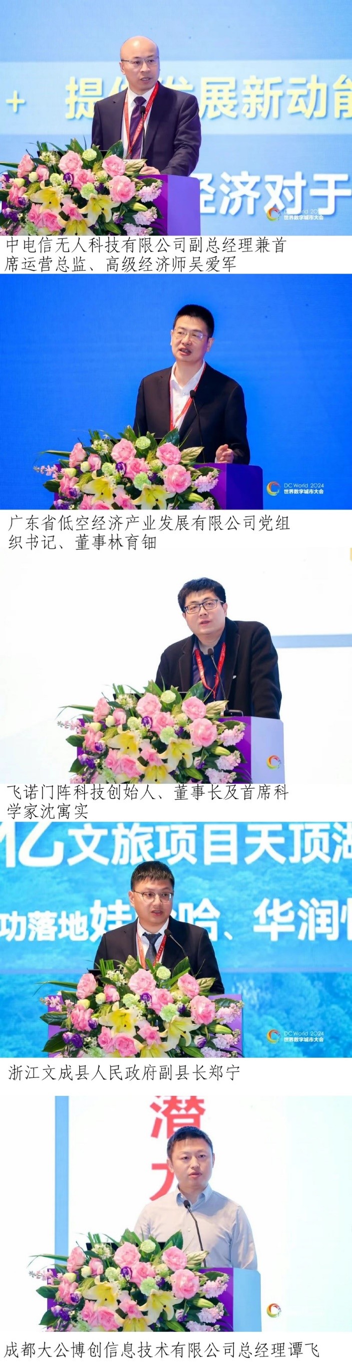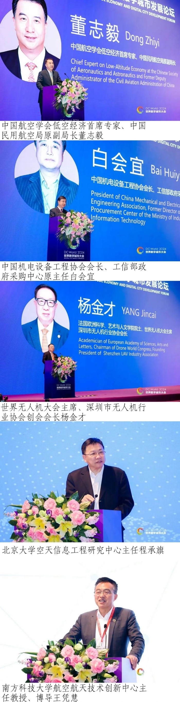 十三届全国政协经济委员会副主任、工业和信息化部原副部长刘利华出席会议,中国航空学会低空经济首席专家、中国民用航空局原副局长董志毅,中国机电设备工程协会会长、工信部政府采购中心原主任白会宜,世界数宇城市大会组委会副主席、深圳市社会组织总会执行会长苏建东,法国欧洲科学、艺术与人文学院院士、世界无人机大会主席、深圳市无人机行业协会创会会长杨金才,莫斯科政府展览中心VDNH总监、欧盟项目创新中心(成都)驻俄罗斯代表安东•萨夫琴科致辞,国家空管委专家咨询委委员、北京大学空天信息工程研究中心主任程承旗,俄罗斯工程院外籍院士,国际宇航科学院院士,深圳市国家级领军人才,南方科技大学航空航天技术创新中心主任教授、博导王凭慧,中电信无人科技有限公司副总经理兼首席运营总监、高级经济师吴爱军,广东省低空经济产业发展有限公司党组织书记、董事林育钿,欧洲科学院外籍院士,格鲁吉亚国家科学院外籍院士、飞诺门阵科技创始人、董事长及首席科学家沈寓实,浙江文成县人民政府副县长郑宁,成都大公博创信息技术有限公司总经理谭飞做论坛主旨报告,黑龙江省大庆市发改委党组成员、副主任蒋希明,投石产业科技有限公司董事长徐凯祥,蓝天实验室低空空域管理应用研究中心副主任韩恒刚,普宙科技有限公司副总经理胡倩,武汉飞流智能技术有限公司蕫事长刘奇,赛博龙科技创新有限公司CEO陈启轩,深圳联和智慧科技有限公司解决方案水利行业总监黄飞跃参与圆桌讨论。