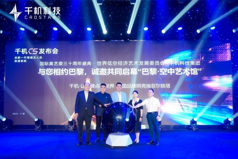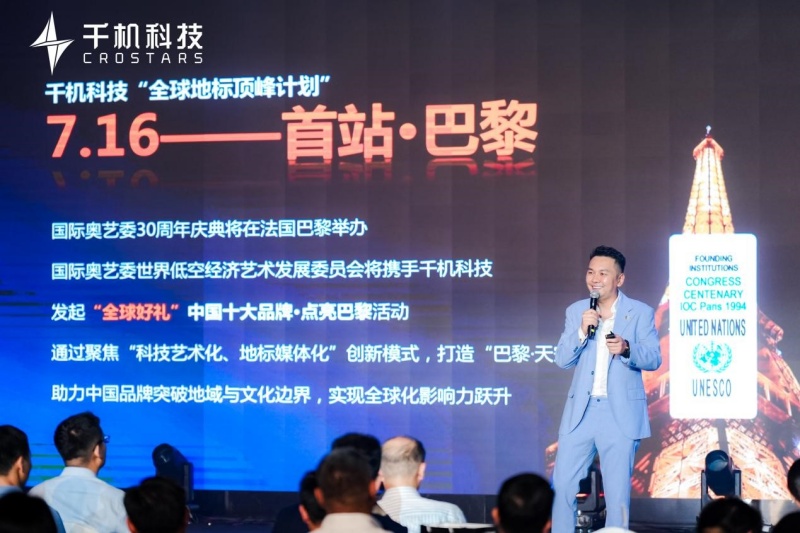 集团创始人石哲元在开场致辞中介绍了千机科技2025年的全新战略“千机·让品牌点亮世界”,全球100+“天空艺术馆”发展计划,由国际奥艺委世界低空经济艺术发展委员会联合千机科技发起的“用艺术点亮世界——全球地标顶峰计划”。他表示在今年7月16日,在法国巴黎联合国教科文总部举办的“2025国际奥艺委三十周年盛典”系列活动中,世界低空经济艺术发展委员会将携手千机科技与十大中国品牌,共同点亮巴黎埃菲尔铁塔,为中国企业的国际化征程增添光彩。随后,秦雯主席、孔令涛主席、石哲元主席、黄志勇主任、刘延申教授共同开启了奥艺委点亮仪式。