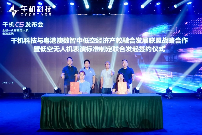 值得一提的是,在发布会现场,千机科技举行了与粤港澳数智中低空经济产教融合发展联盟战略合作备忘录签署仪式。此次合作旨在深化粤港澳大湾区中低空经济产业与无人机文旅科技的协同创新,推动产教融合与无人机表演技术在文旅领域的应用示范,促进无人机飞行表演领域的专业化、标准化与规模化发展。